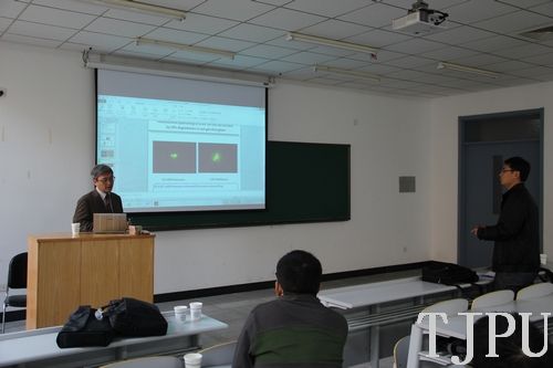 报告会上,末信一朗教授阐述了基于荧光淬灭机理实现有机磷化合物实时检测的生物传感器。制备掺杂有绿色荧光蛋白质的溶胶凝胶平面波导以及酵母菌细胞表面的有机磷水解酶,并将二者混合。加入有机磷化合物后,酵母菌细胞破裂,水解酶水解细胞得到硝基苯酚,其中的二价离子对荧光有增强作用,发生荧光淬灭从而检测有机磷化合物。由于杀虫剂中含有大量有机磷化物,可以通过该传感器实现对人体有害的杀虫剂的快速检测。报告结束后,与会的师生就相关研究领域方面的问题作了提问,末信一朗教授对大家提出的问题进行了详细的解答。