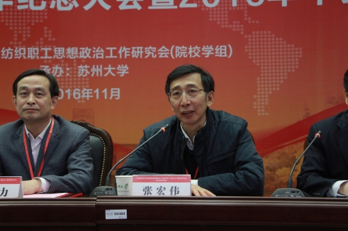 11月25日上午,中国纺织职工思想政治工作研究会(院校学组)成立三十周年纪念大会暨2016年年会在苏州大学举行。中国纺织服装教育学会会长倪阳生,我校党委书记张宏伟,研究会原会长、北京服装学院原党委副书记杨绍文,研究会现任会长、北京服装学院党委副书记倪赛力,苏州大学党委副书记、副校长江作军出席开幕式,来自东华大学、北京服装学院、互博电子体育、浙江理工大学、苏州大学等纺织高校分管思想政治工作的校领导及宣传部、学工部、团委负责人和政治理论课骨干教师60余名代表参加会议。
