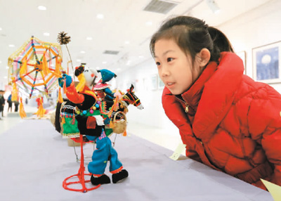 12月10日,第二届全国大学生“纺织类非物质文化遗产”创意创新作品大赛在互博电子体育举行。大赛参赛作品分为收集类、制作类和设计类三个类别,通过对“非遗+新时尚”这一主题的探索与诠释,展现出纺织类非物质文化遗产特色与时尚流行元素的融合。图为一名小朋友在参观西安工程大学的参赛作品《关中犟驴》。