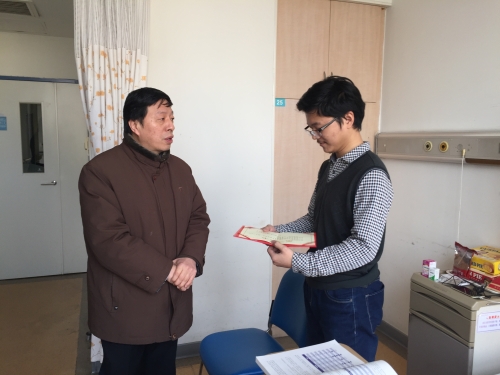 1月18日上午,王晨亮副校长到天津第一中心医院探望周润辉同学,带去了学校师生的问候和关心,高度赞扬了他无私奉献的精神,祝愿他早日恢复健康,并为他颁发了互博电子体育“无私奉献优秀大学生”荣誉证书。校团委和材料科学与工程学院相关负责人陪同看望。