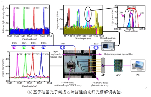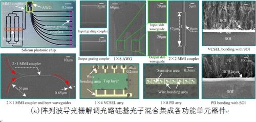 硅基光子学的发展为光学系统的小型化提供了可能,李鸿强教授课题组通过“光纤光栅光子学”与“半导体光电子学”之间的交叉融合,首次开展了光纤光栅解调光路硅基光子混合集成的研究。将III-V族垂直腔面发射激光器、多模干涉耦合器、光栅耦合器、阵列波导光栅和III-V族光电探测器等各功能单元器件进行异构集成,利用光束传播法和时域有限差分法进行各功能单元器件的理论建模和光学特性仿真优化,基于顶层硅厚度为220nm、掩埋层二氧化硅厚度为2μm的SOI晶圆,完成了输入/输出光栅耦合器阵列、多模干涉耦合器、阵列波导光栅的SOI光子集成芯片流片,利用苯并环丁烯作为键合介质进行了III-V族片上光源和光电探测器的混合集成。