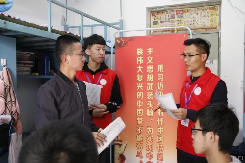李渊博等4名领读团成员来到东苑3号楼1227宿舍,开展了“践行核心价值观,争做文明工大人”主题学习。