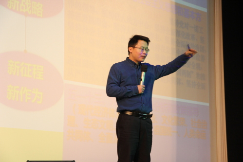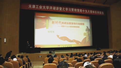 2017年11月12日上午,我校“泮湖讲堂之学习贯彻党的十九大精神”系列报告会在艺缘礼堂举行,特别邀请天津市“两学一做”宣讲团成员、天津市委党校倪明胜做题为“新时代的政治宣言和行动纲领——十九大报告精神解读”专题报告。全体辅导员、各学院学生党员等近800人参加,报告会由学工部副部长张录全主持。
