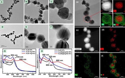 利用该体系,尹振课题组进一步实现了金@银核壳结构的一维自组装,得到了具有异质结构的纳米链,这是之前很少有人可以做到的,如图2。此外,这种结构的优势在于,通过控制Ag壳层的厚度,可以调节颗粒的吸收性能和SPR效应。