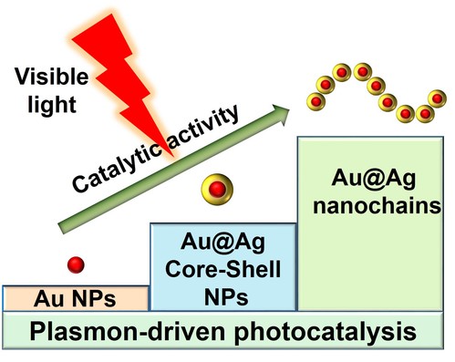 论文论述了表面等离子体效应直接驱动光催化反应的热点问题。该反应的一个明显特点是,无需半导体材料来吸收光子,取而代之的是具有表面等离子体效应(LSPR, Localized surface plasmon resonance)的金属纳米催化剂。尹振等人的研究表明:将金的纳米颗粒作为核,用银薄层做壳层,在可见光作用下,可以将催化加氢的反应活性提高约10倍;而进一步将该核壳结构通过自组装形成一维链状结构后,可将催化活性继续提高2倍左右。该结果不但首次直接证实金-银核壳纳米结构可以利用表面等离子体共振效应直接驱动光催化加氢反应,而且首次提出通过自组装形成的一维结构可以增强催化剂的可见光催化活性。