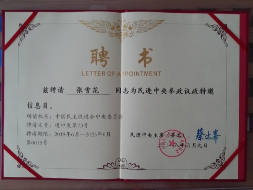 会上,34位参政议政特邀研究员、28位参政议政特邀信息员被授予聘书。天津市河东区政协常委、民进天津市委会生态环境与资源委员会副主任、我校环境经济研究所所长张雪花教授,被聘为民进中央参政议政特邀信息员,并代表参政议政特邀信息员在会上作了发言。张雪花教授此次受聘,系我校民进成员首次被聘为参政议政特邀信息员。