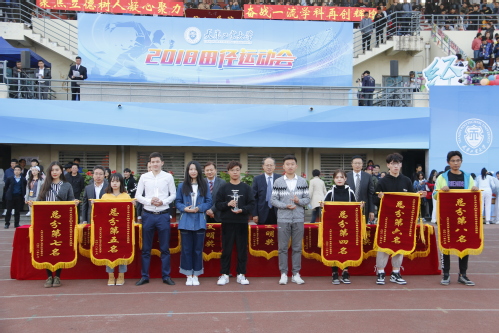 经过一整天的激烈角逐,运动会接近尾声,本次运动会总裁判长张嵬宣布运动会团体成绩,获得学生组团体奖前八名的单位是经管学院、电气学院、理学院、国际教育学院、艺术学院、计算机学院、电信学院、人文学院和纺织学院,获得职工组团体奖前八名的单位是电信学院、理学院、电气学院、机械学院、材料学院、经管学院、纺织学院和法学院。校工会常务副主席、本次运动会精神文明评委会副主任徐先林宣布精神文明奖和优秀组织奖评选结果,材料科学与工程学院、电气工程与自动化学院、国际教育学院、纺织学院、环境与化学工程学院、经济与管理学院等6个单位荣获精神文明奖,机械学院等14个参赛单位获得优秀组织奖。随后,校领导为获奖代表队和获奖单位颁奖。