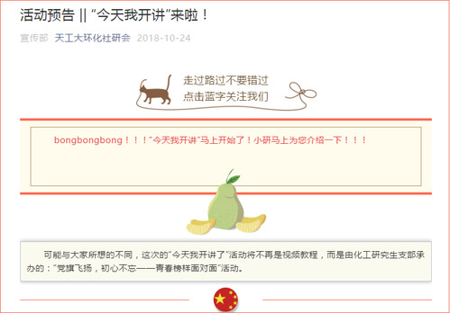 “这周‘今天我开讲’的票你抢到了吗?”化学工程与工艺专业学生党支部的任佳豪,在抢到“今天我开讲”的票后正在兴奋地寻找一同上党课的小伙伴。为进一步强化政治引领,提升理论水平,化学与化工学院党委、环境科学与工程学院党委建立了“今天我开讲”党课平台,每两周安排一次党课宣讲。2018年以来,该党课平台以“书记讲党课”、邀请专家作报告、优秀党员先进事迹分享、播放精品党课视频等多种方式开展了近20场活动,参与人数达2000余人次。为调动师生学习的积极性,每次“开讲”前三天,学院社研会公众号都会发布预告信息,大家通过抢票、填写个人信息进行报名,很多时候手慢一点就抢不到票,这也让大家更加珍惜上党课的机会。为切实提高学习效果,近期又在“今天我开讲”中加入了“随学随考”的小测,让大家在学习结束时趁热打铁,进一步巩固学习效果。互博电子体育各基层党组织正是通过这种授课和参与形式上的创新,不断提升党员政治理论学习的积极性和主动性,促进了广大师生对党的路线、方针、政策的政治认同、思想认同与情感认同。