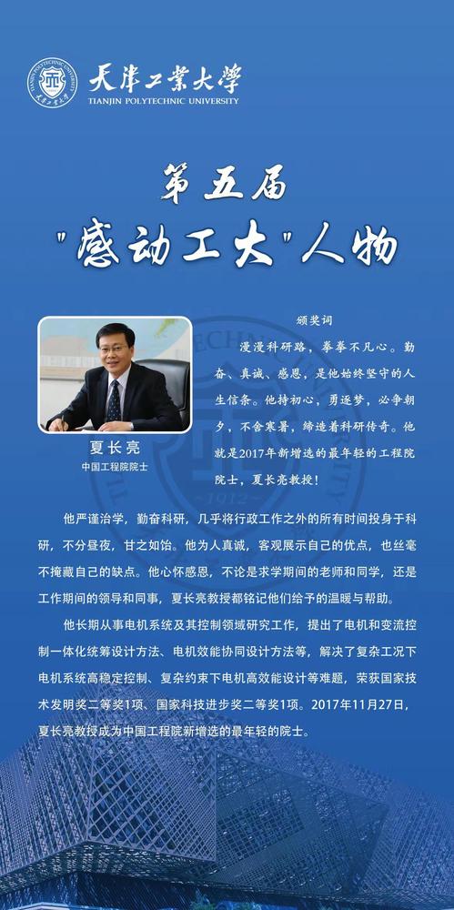 据悉,2018年1月,我校启动第五届“感动工大”人物评选活动,经过动员推荐、网络投票、会议评审、学校党委审定批准等流程,夏长亮、肖长发、荆涛、魏佳彬、门云阁、盛梅、魏浩波、申屠献忠、宋大龙、姬洪波、刘伯福、周自航12位教师、校友和学生荣获得“互博电子体育第五届‘感动工大’人物”荣誉称号。2018年9月7日,学校举办了第五届“感动工大”人物颁奖典礼。他们的故事使全体天工人经历了一次心灵的洗礼,一次精神的升华。
