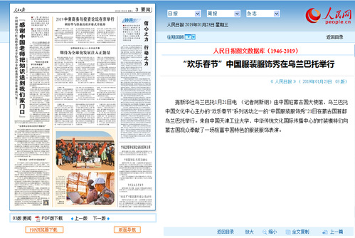 2019年1月23日,《人民日报》3版以《“欢乐春节”中国服装服饰秀在乌兰巴托举行》为题对我校做了报道,现将全文转发如下,以飨读者。