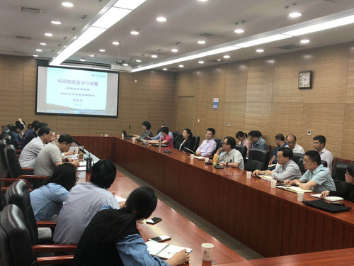 2019年5月10日上午,在行政中心第五会议室,由科学技术研究院、科技合作与成果管理处和财务处主要负责人对我校科研制度进行宣讲与预警提示。会议由科学技术研究院常务副院长魏俊富主持,科技合作与成果管理处处长王威和财务处处长李鑫及各学院主管科研院长和科研秘书等参加了本次会议。