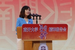 宣讲团李军老师聚焦校友、食堂厨师、司机师傅等“小人物”,展现了每一位南开人的爱国情怀。宣讲团艾伟俊曾在甘肃省庄浪县高房村挂职第一书记一年半,他讲述了奋战在脱贫攻坚的第一线的南开故事。宣传团曹莲娜老师讲述了南开大学学生合唱团如何在世界舞台上唱响中国声音的故事。在报告会即将结束时,曹莲娜老师指挥全场高场合唱《我和我的祖国》,身穿少数民族服装的大学生合唱团到台前演唱,中华儿女血脉相连的情怀在此刻沸腾。“我最亲爱的祖国,我永远贴紧着你的心窝……”全场观众情不自禁地挥起了手中的国旗,齐场高唱,歌声在现场久久回响。全场的氛围达到了高潮。
