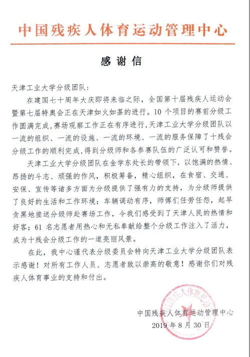 在将近一年的时间内,学校各相关部门高度配合、精诚合作,志愿服务学生工作热情、无私奉献,充分展现了新时代天工人的风采。近日,我校收到中国残疾人体育运动管理中心发来的感谢信,为此次残运会医学分级工作画上了一个圆满的句号。(审稿:场馆管理中心 金学东 编辑:宣传部 杨超杰)