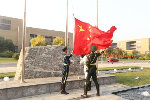 迎着初升的朝阳,国旗护卫队精神抖擞、步伐铿锵地将国旗护送到升旗平台。伴随着庄严的国歌,升旗手奋力挥臂将国旗抛向空中,在全体师生庄严肃立的注目礼中,鲜艳的五星红旗迎风飘扬。