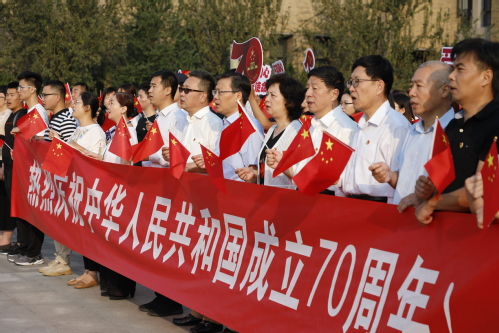 升国旗奏唱国歌活动结束后,现场师生以饱满的热情,跟随旋律齐声高唱《歌唱祖国》。“五星红旗迎风飘扬,胜利歌声多么响亮,歌唱我们亲爱的祖国,从此走向繁荣富强……”悠扬动人的旋律与磅礴嘹亮的歌声响彻活动现场,大家纷纷挥舞起手中的红旗,高举“我爱你中国”“爱我中华”“不忘初心、牢记使命”等标语,深情歌颂了新中国70年来风雨兼程取得的辉煌成就和中华民族自强不息、奋勇前行的豪迈气概。师生们以最热忱、最真挚、最高尚的情感,唱出了对伟大祖国的拳拳热爱之情,为新中国70华诞献礼。