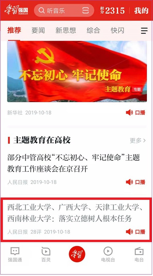 2019年10月18日,《人民日报》2版“守初心 担使命 找差距 抓落实·深入开展‘不忘初心、牢记使命’主题教育”专栏,以《西北工业大学、广西大学、互博电子体育、西南林业大学——落实立德树人根本任务》为题对我校做了报道,学习强国平台“推荐”专栏做了转发。现将全文转发如下,以飨读者。