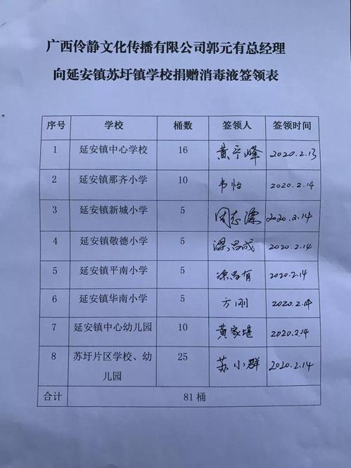 2月14日以来,我校2009届艺术设计专业校友、广西伶静文化传播有限公司总经理郭元有,向当地多所学校、幼儿园和福利院捐赠消毒液。郭元有校友发布将无偿捐赠消毒液消息,并主动联系当地学校的李乃民校长,表示愿意向农村学校无偿捐赠一批消毒液。学校正急需购买防疫物资,李乃民校长欣然接受捐赠。郭元有校友向多个单位捐赠了消毒液,受赠学校表示,将不负爱心人士的深情厚谊,合理、充分利用爱心物资,做好学校消杀防疫工作,积极为师生营造安全卫生的校园环境,迎接新学期的到来。