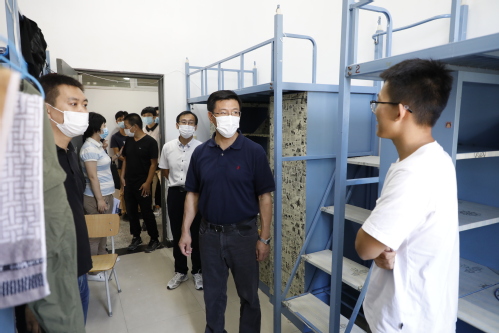 2020年9月17日上午,学校新冠肺炎疫情防控工作指挥部副指挥长、校党委副书记胡英江带队赴学生公寓区新生报到现场进行全覆盖实地检查,督促常态化疫情防控工作落实,查找薄弱环节,加强工作指导,对发现的问题进行现场办公,及时加以解决。党委(校长)办公室、党委宣传部、党委学生工作部、保卫处、后勤管理处、团委等相关职能部门负责人陪同检查。