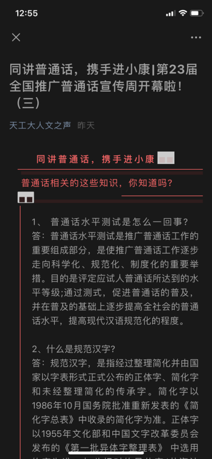 各单位围绕“推普周”主题,开展了一系列形式多样的“推普”活动。学工部组织学生开展了“我们是新时代爱国者”“学宪法 讲宪法”“爱我中华 爱我天津”中华传统文化优秀作品经典诵读主题演讲比赛;团校秘书处开展了“推普周”主题团日活动,科普普通话的演变由来,普通话水平测试的等级标准和大体考试内容等,观看了如何训练好普通话和南北方语言差异的视频片段,详细讲述了n、l音节、前后鼻音、联绵词等平时讲话需要注意的重点难点,为同学们今后同讲普通话、铸牢中华民族共同体意识奠定了很好的基础;学生科技协会通过个人演讲、学习材料共享、规范文字书写等方式进行普通话宣传活动,介绍推广普通话和使用规范字的意义,在广大创客中进行自我普通话展示测试和辅导;博雅书院推送主题为“走进传统文化----有趣的汉字”系列微信公众号,以图文视频结合的形式,从走进话题、汉字起源、汉字种类、汉字演变四个方面展开介绍,并开发“学学普通话”微信小程序,组织法学院全体研究生和本科生参与普通话发音答题竞赛活动,这款小程序功能丰富,使用简便,同时又具备趣味性,得到师生的一致好评;研究生院就学位论文语言文字的规范性对新生做了入学教育;科研院、科技合作与成果管理处积极鼓励相关学科开展语言文字研究和语言文字类科研项目立项。