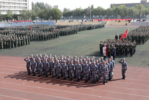 俞绍平书记下达分列式开始命令后,伴随着激昂的《中国人民解放军进行曲》,各营连方队高喊着响亮的口号,迈着整齐的步伐,接受学校领导和部队首长的检阅。随后,进行学生军训成果汇报表演,军体拳方队英勇飒爽;匕首操表演刚柔并济;战术演练分队密切协同,赢得全场阵阵喝彩和掌声。