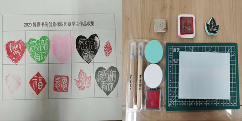 感恩篆刻:同学们以橡皮为材料,在老师的指导下,领会实践篆刻艺术,一枚枚橡皮章,创意无限,满满耐心与爱心。