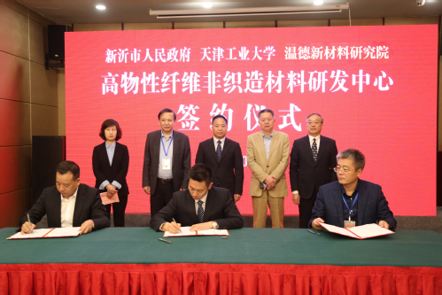 2020年10月27日,我校与江苏省新沂市人民政府、江苏温德新材料研究院有限公司共建“高物性纤维非织造材料研发中心”签约仪式在江苏省新沂市举行。副校长姜勇出席,科技合作与成果管理处处长姚金波、纺织科学与工程学院常务副院长姜亚明、副院长刘雍、项目负责人钱晓明及项目组成员,新沂市市委书记高山、常务副市长孙秀云、市人大常委会副主任马林、副市长吴应鹏以及新沂市政府相关部门主要负责人、江苏温德实业发展有限公司总经理陈铭、顾问魏建明和江苏温德新材料研究院有限公司执行院长宋兵等参加了签约仪式。
