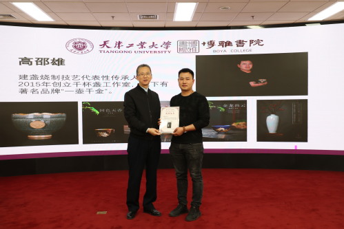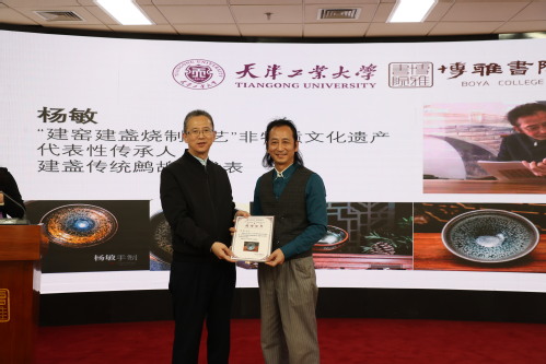 下午2点,建盏捐赠仪式在博雅报告厅隆重举行,我校副校长姜勇,“建窑建盏烧制技艺”非物质文化遗产代表性传承人杨敏,建盏烧制技艺代表性传承人高邵雄,福建省南平市建阳建盏青年新秀游超,我校校友工作办公室、博雅书院、图书馆等单位负责同志,我校校友万长铭,南开大学文学院教师吴若明,天津科技大学艺术学院教师张新沂,茶文化爱好者共50余人出席了捐赠仪式。杨敏、高邵雄、游超、周运隆、余奇骏五位老师向学校捐赠了专门制作的雀影惊鸿、金凤凰天目金盏、扶摇、点茶盏、火莲系列支钉烧建盏等25件作品,为学校和广大师生献上一份厚礼。