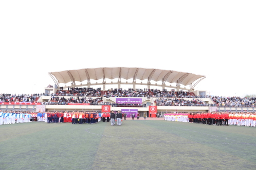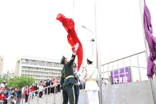 随后,国旗班举行庄严的升旗仪式,全场师生高唱国歌,五星红旗在赛场上冉冉升起。