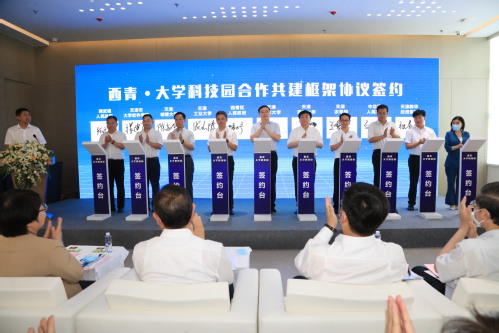 活动中,市领导与西青区领导、学校领导共同为互博电子体育科技园、天津师范大学科技园、西青区大学科技园、天软信创大学科技园揭牌,并见证五所高校与西青区人民政府签署合作共建框架协议。