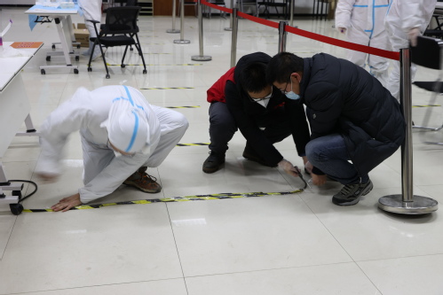 清晨6:30,工作人员早早地集合在一起,在指挥部的统筹下,对信息录入志愿者再次进行培训。检测工作开始前,全体工作人员进行预演,确保所有流程和内容烂熟于心。