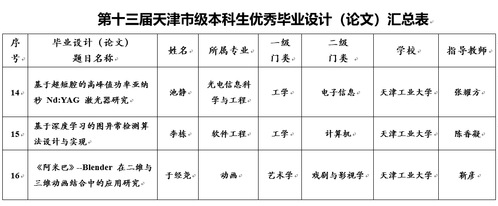 毕业设计(论文)是本科教学环节的重要组成部分,是对学生本科阶段学习成果、创新能力和自身素质的综合检验。在各学校推荐的基础上,天津市教委专家组对全市各普通高校报送的103份优秀毕业设计(论文)申报材料进行了评审,最终全市共有53篇被确认为第十三届天津市级优秀毕业设计(论文)。