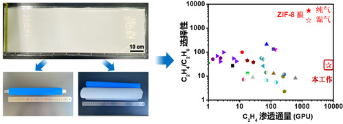22400 cm2 ZIF-8实物图4800 cm2 ZIF-8卷式膜组件及内部图和ZIF-8C2H4/C2H6分离性能图