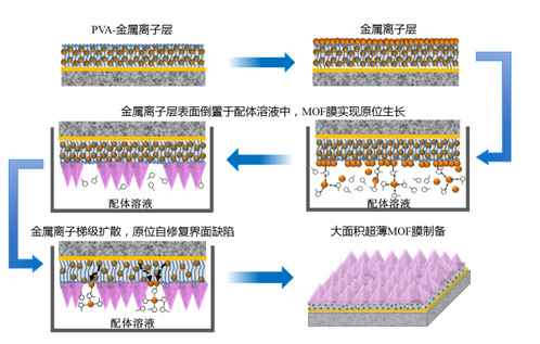 如图1所示,首先将具有聚乙烯醇(PVA-金属离子界面层的PSf超滤膜浸入纯金属离子溶液中,在其表面形成纯金属离子层;再倒置浸入配体溶液中纯金属离子层中金属离子作为MOF膜生长的成核位点与溶液中的配体发生反应,形成MOF,但会产生一定的缺陷。进一步,PVA-金属离子层中的金属离子扩散到界面缺陷区域,二次成核,原位自修复界面缺陷(图1),进而制备出大面积超薄MOF膜及卷式膜组件,展现优异的C2H4渗透通量和良好的C2H4/C2H6选择性2