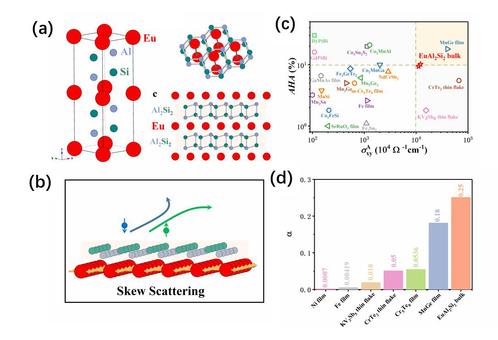 图1、EuAl2Si2合金晶体结构、散射机制、反常霍尔角AHA和斜散射系数