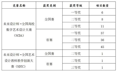 其中,在NCDA大赛中,我校获全国总决赛一等奖6项、二等奖8项、三等奖11项;获省赛一等奖37项、二等奖36项、三等奖45项。来自艺术学院、机械工程学院、计算机科学与技术学院的高彬、徐娜、王芝湘、孙戈、范文娲、徐丕文等多位老师获优秀指导教师奖,高立燕老师获优秀组织教师奖,学校获NCDA大赛全国总决赛杰出组织奖。在NDTC大赛中,我校教师团队获全国赛二等奖1项,省赛二等奖1项、三等奖1项,学校获大赛优秀组织奖。